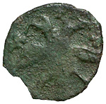 Московское государство. Иван III Васильевич (1462–1505 гг.). Пуло, недатированное. Москва. Лиц. ст.: двухглавый орел, с цветочками в клювах. Медь, 0,44 г. Сохранность очень хорошая, рыхлая патина, край монеты обломан. Довольно редкое.