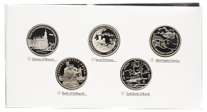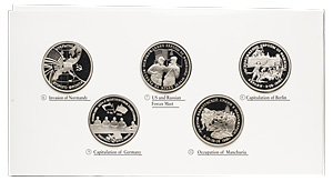 Набор из 10 полированных медно-никелевых монет СССР и РФ «события второй мировой войны». 1991-1995 гг. В блистере с сопровождающими текстами и иллюстрациями на английском. Сохранность полированная. (10)