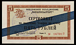 Всесоюзное Объединение «ВНЕШПОСЫЛТОРГ». Сертификат 5 рублей